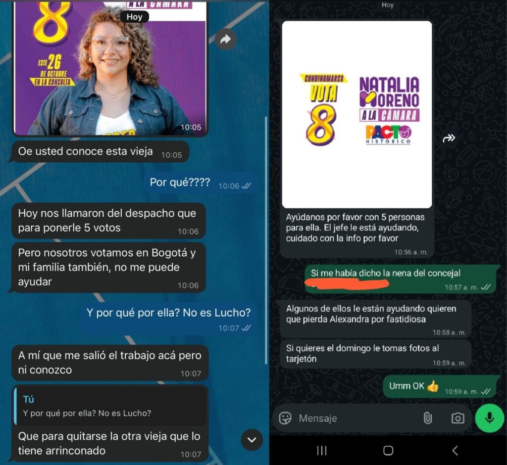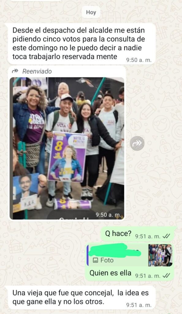 Según los mensajes, se les habría pedido conseguir al menos cinco votos para una candidata del Pacto Histórico en la consulta interna que se realizará este domingo 26 de octubre.