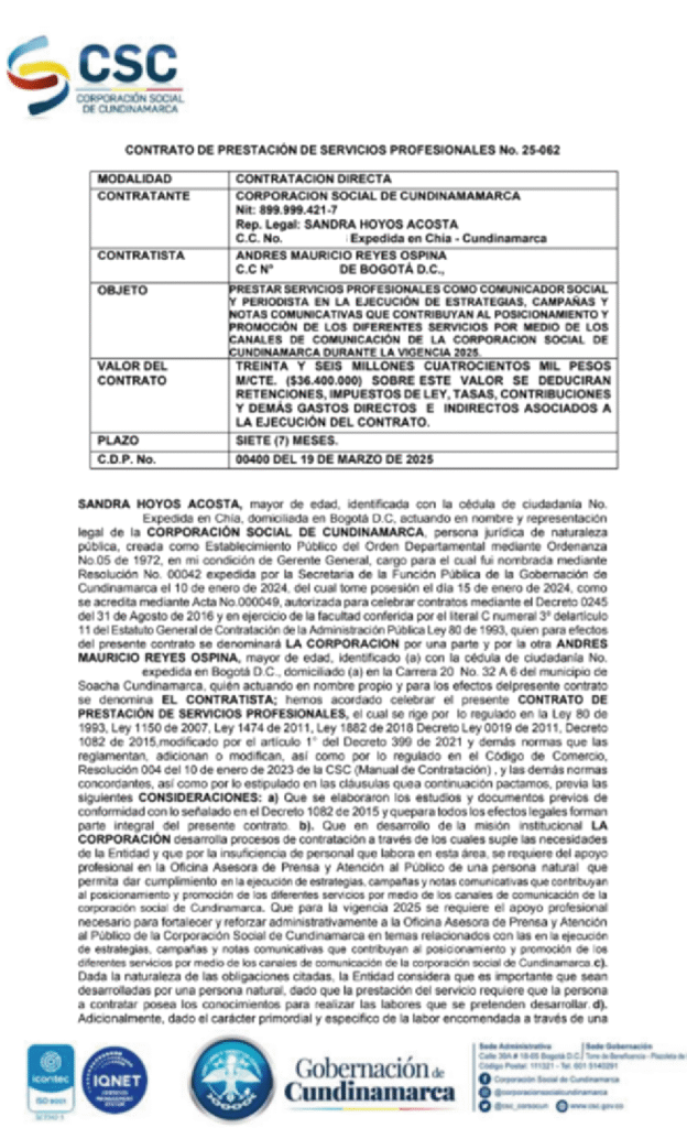 - Andrés Reyes, pertenece directamente al grupo político de Heiner Gaitán y es contratista de la Gobernación de Cundinamarca en 2024 por 10.000.000 de pesos y en 2025 por 36.400.000.