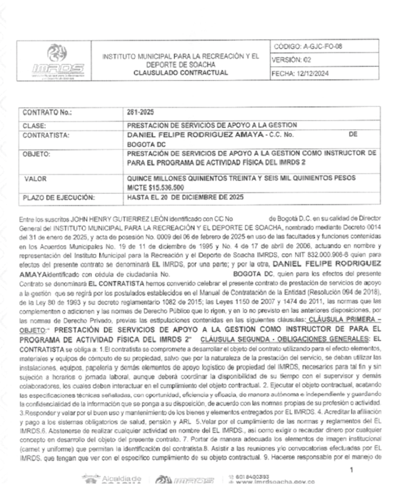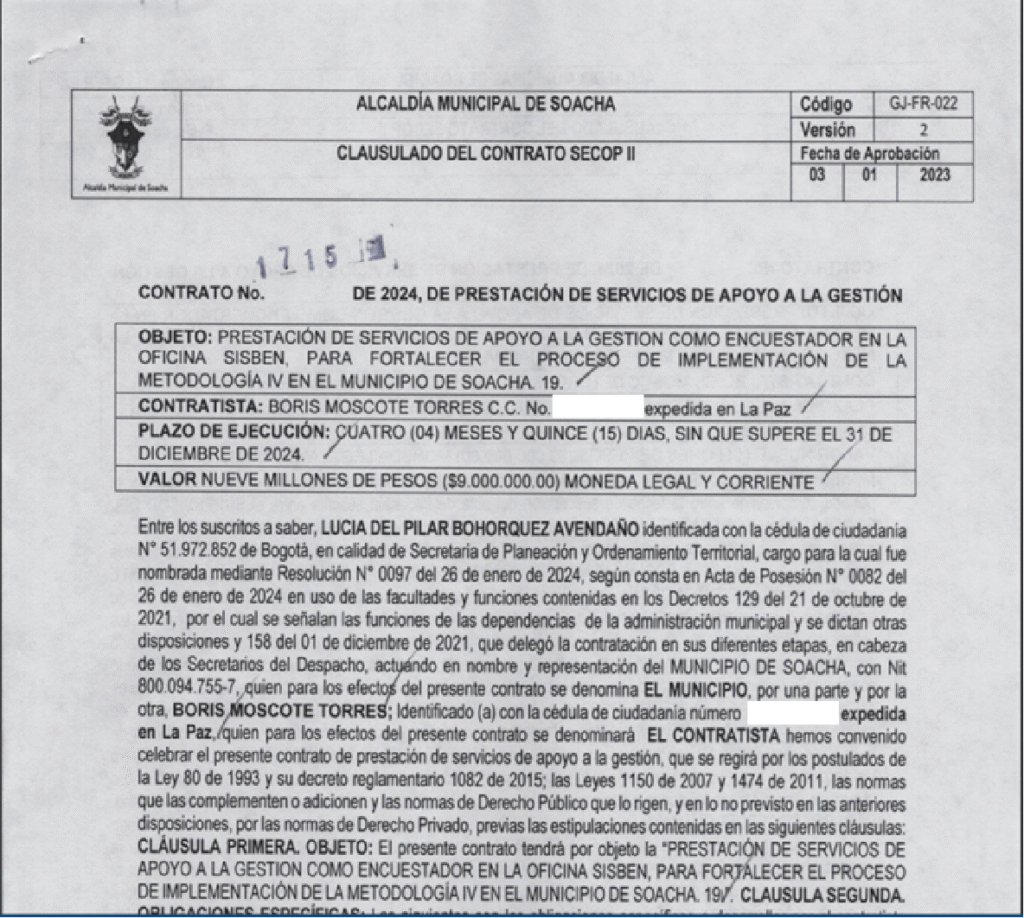 - Boris Moscote, militante de Soacha Humana y contratista de la Alcaldía de Soacha en 2024 por 9.000.000 de pesos.