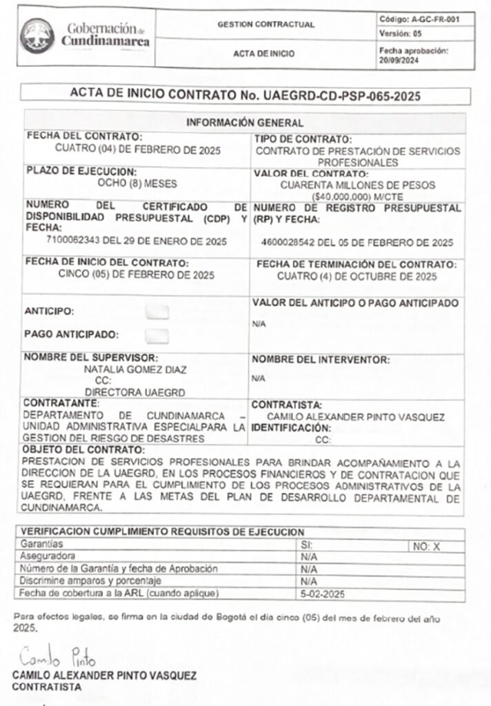- Camilo Pinto, militante de la Unión Patriótica, contratista con la Gobernación de Cundinamarca en 2025 por un valor de 40.000.000 de pesos.