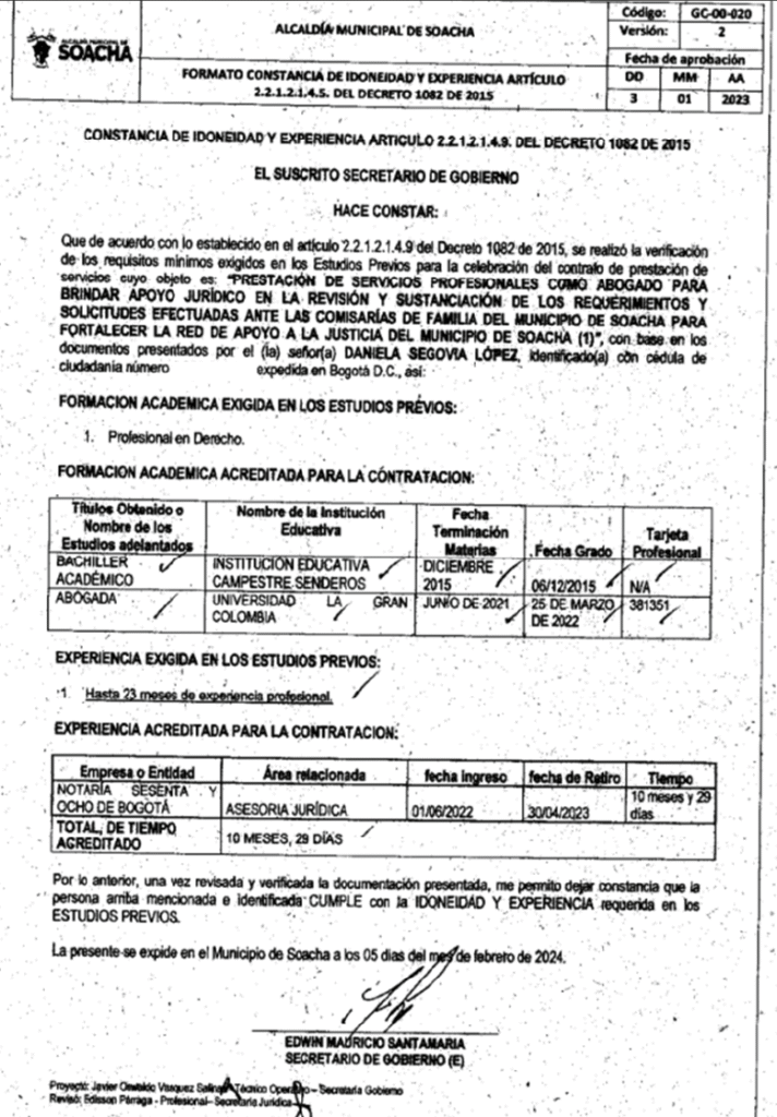 - Daniela Segovia, militante de la Unión Patriótica, mano derecha de la concejala Yudy y contratista de la Alcaldía de Soacha en 2024 por 50.000.000 de pesos y por 13.300.000 pesos.