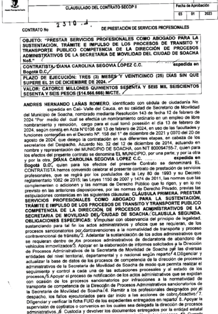 - Carolina Segovia, hermana de Daniela Segovia, y contratista de la Alcaldía de Soacha en 2024, con 14.566.666 pesos.