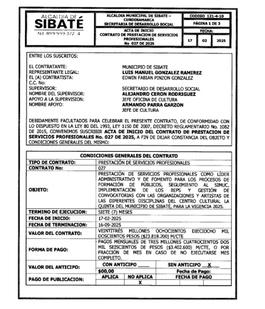 - Fabián Pinzón, miembro del grupo político de Heiner Gaitán; durante 2024 tuvo 2 contratos con la Alcaldía de Soacha y Sibaté, y en 2025 continúa teniendo 2 contratos iguales con las mismas alcaldías.
