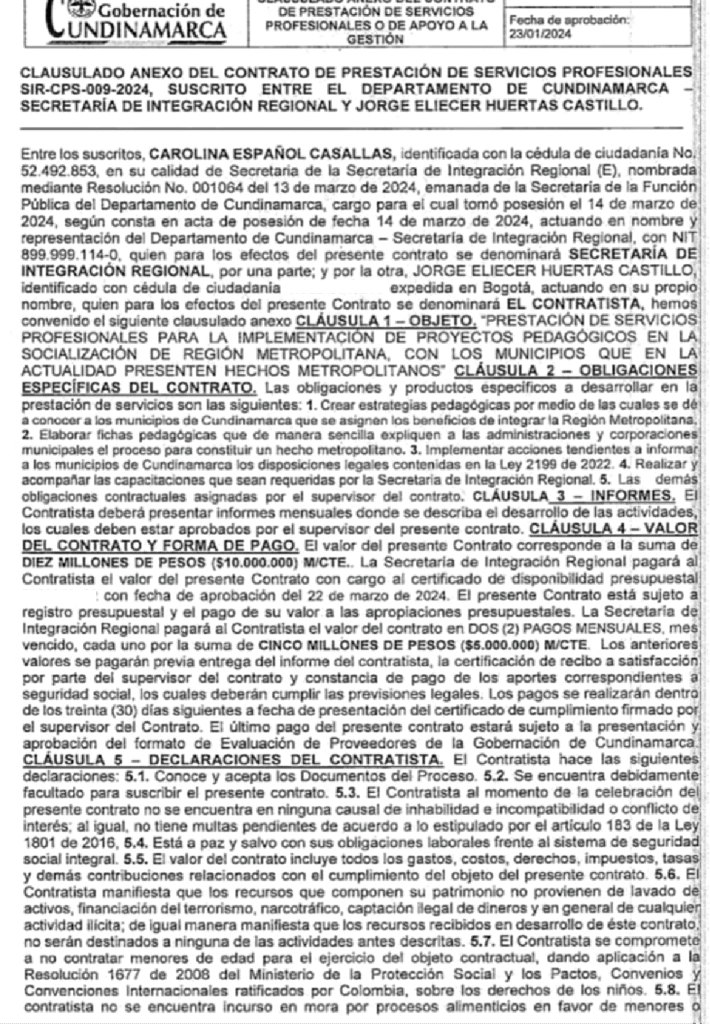 - Jorge Eliecer Huertas, vicepresidente de Colombia Humana, contratista de la Gobernación de Cundinamarca en 2024 por un valor de 10.000.000 de pesos.
