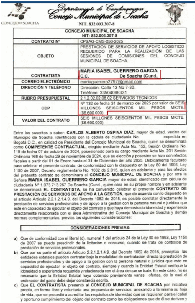 - María Isabel Guerrero, prima de la concejala Yudy y contratista del Concejo de Soacha en 2025 por un valor de 6.600.000 pesos.