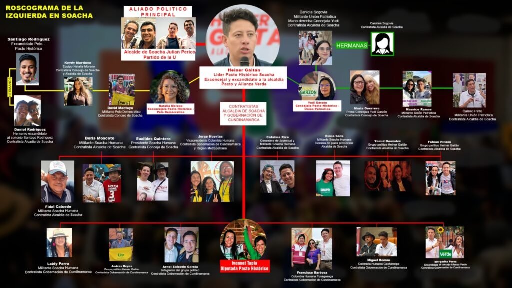 Después de una revisión exhaustiva en Secop y otras plataformas de datos abiertos y de contratación pública, se pudo corroborar que en la casa del Dios Varón hay un roscograma, liderado por un actual candidato a la Cámara, que tiene toda una estructura política promocionando su campaña por el Pacto Histórico para Cundinamarca, misma estructura que ha corrido su línea ética y está trabajando o viene de hacer parte de la nómina de contratistas de Julián Sánchez ‘Perico’, alcalde de Soacha por el Partido de la U, y de Jorge Emilio Rey, gobernador de Cundinamarca por Colombia Renaciente, apoyado también por Cambio Radical, Partido Conservador y el Partido de la U, entre otros.