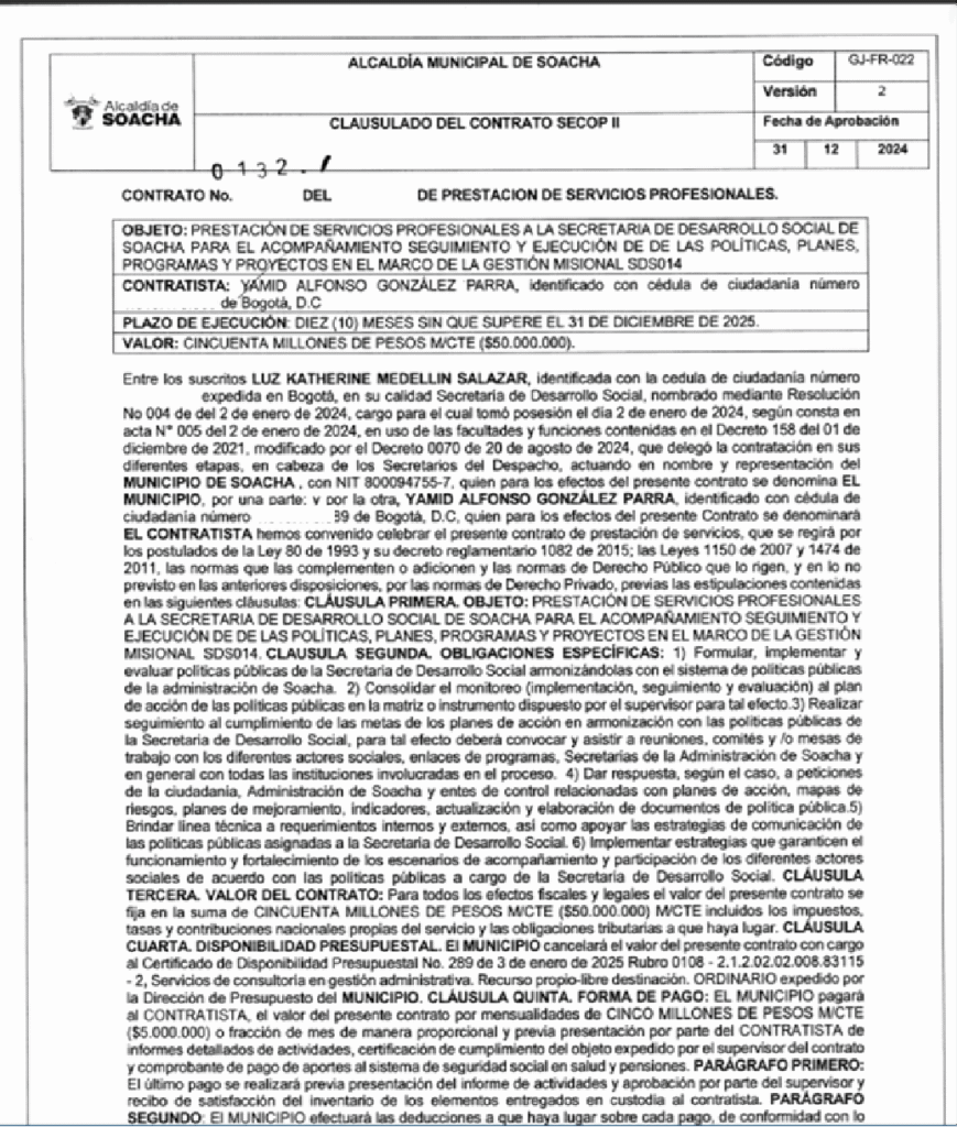 - Santiago Rodríguez, excandidato al Concejo de Soacha por el Polo – Pacto histórico tiene a su hermano como contratista de la Alcaldía de Soacha en 2024 y 2025.