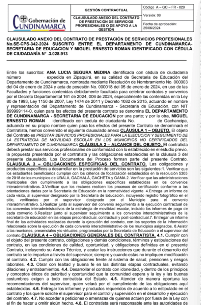 - Miguel Román, miembro de Colombia Humana Gachancipá, contratista en 2024 con la Gobernación de Cundinamarca por 25.078.670 pesos.