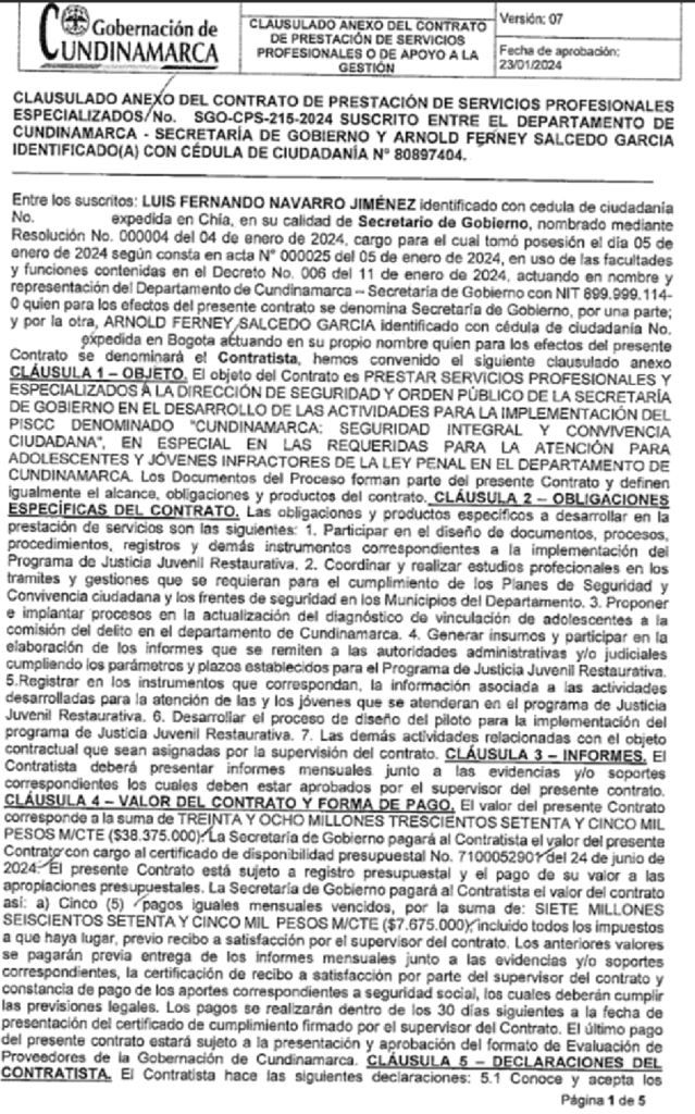 - Arnol Salcedo García, integrante del grupo político de Heiner y Desde el 2024 ha tenido dos contratos con el departamento de Cundinamarca y con la Secretaría de Gobierno. El primero con fecha de inicio el 18 de agosto de 2024 y el segundo con fecha de inicio 10 de junio de 2025.