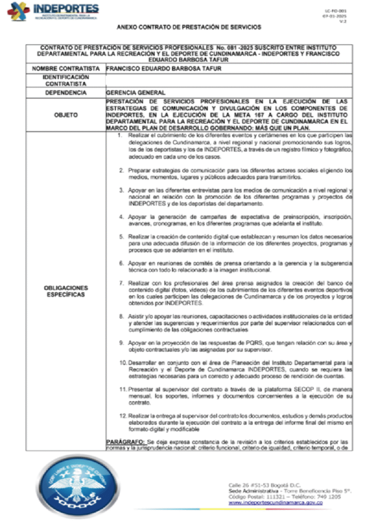 - Francisco Barbosa, miembro de Colombia Humana Fusagasugá, contratista en Indeportes en 2025 por 34.400.000 pesos.