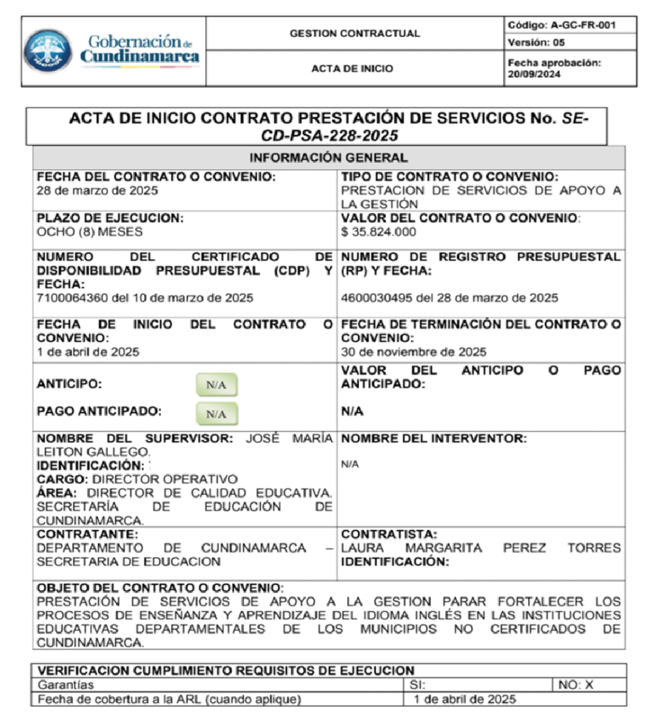 - Margarita Pérez, excandidata al Concejo de Soacha en la lista del Verde de Heiner Gaitán y contratista de la Gobernación de Cundinamarca en 2025 por 35.824.000 pesos y en 2024 por 12.688.160 pesos.